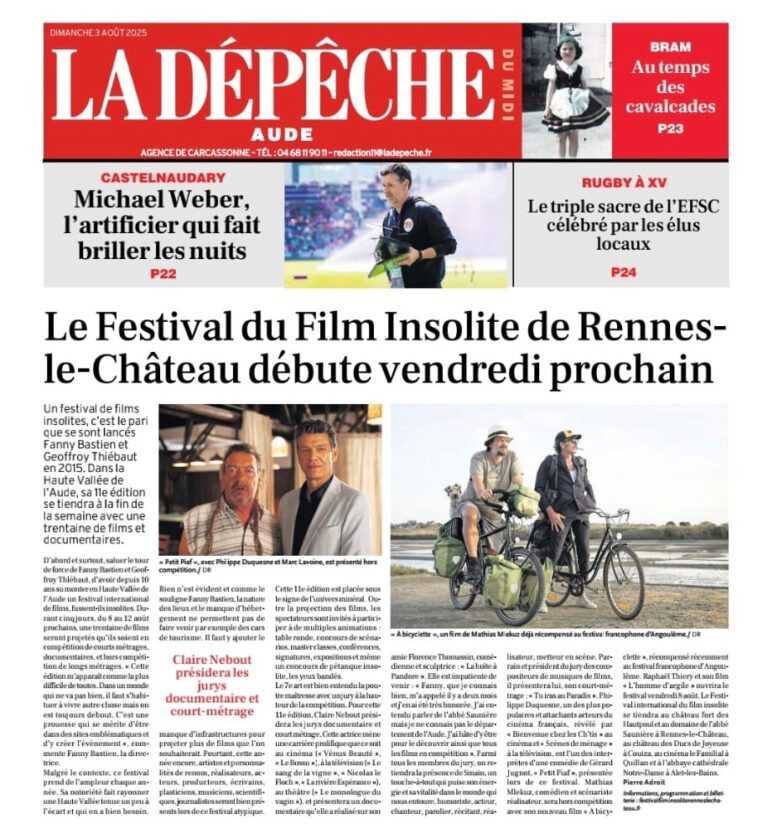 Le Festival Insolite 2025 met à l’honneur Mathias Mlekuz et son film émouvant À Bicyclette !. Ce docu‑fiction, mêlant voyage et mémoire, raconte le périple à vélo du réalisateur en hommage à son fils disparu. Un récit poignant qui a déjà touché le public, et qui fait l’objet d’un article dans La Dépêche du Midi – Pays de l’Aude.